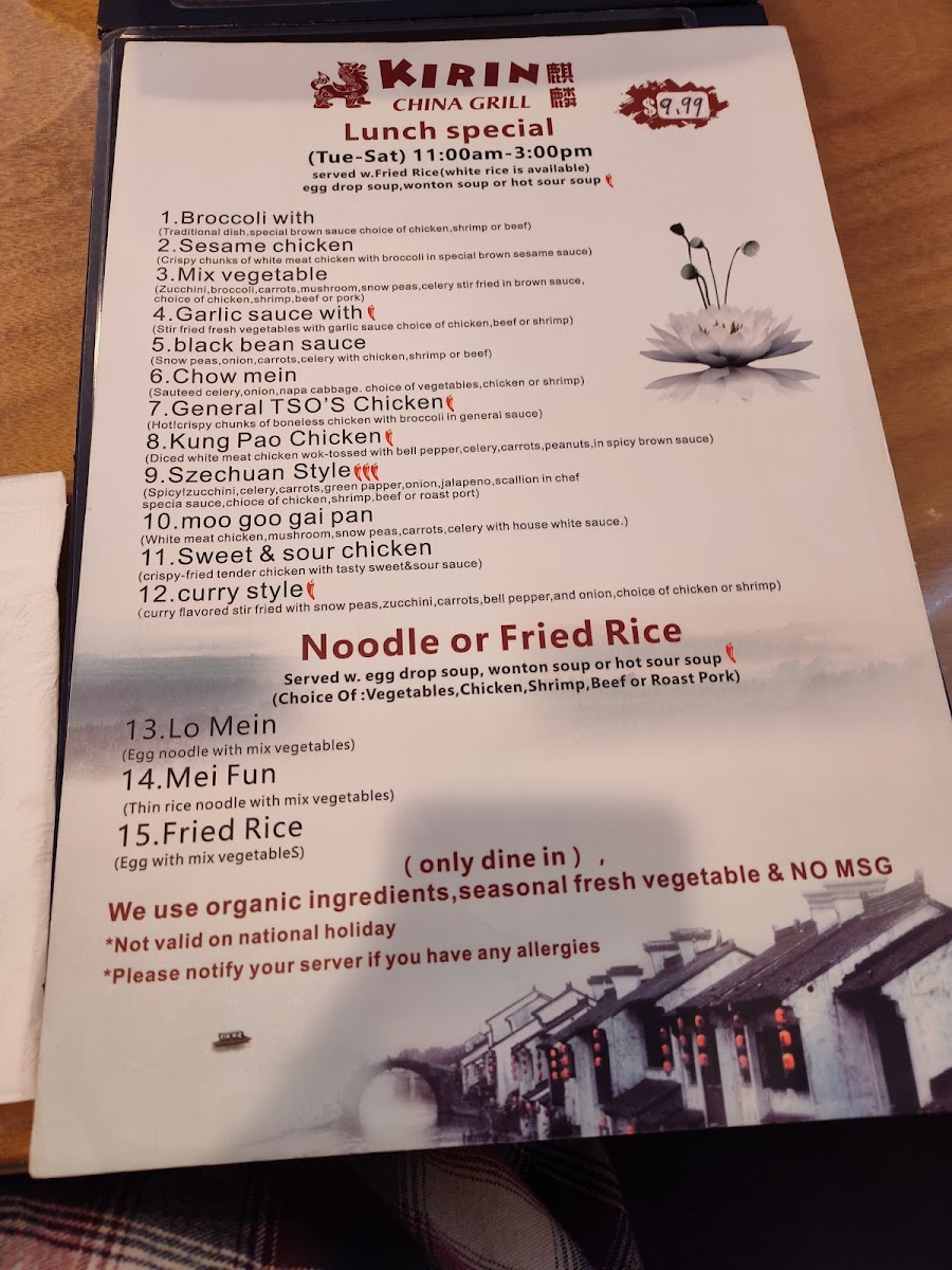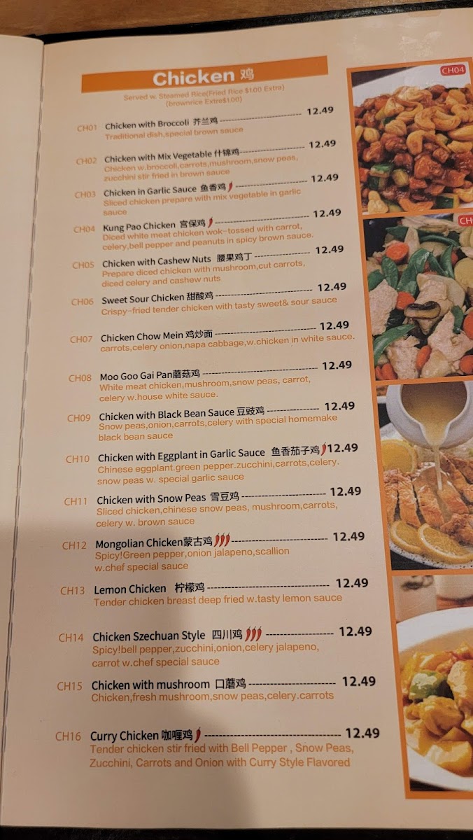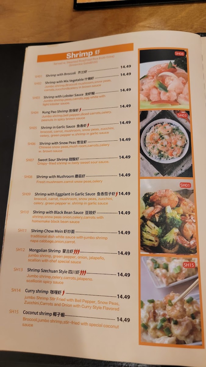 Spicy. Jumbo shrimp, scallops, beef, chicken, roast pork, stir-fried with broccoli, carrots, shiitake mushroom and zucchini.