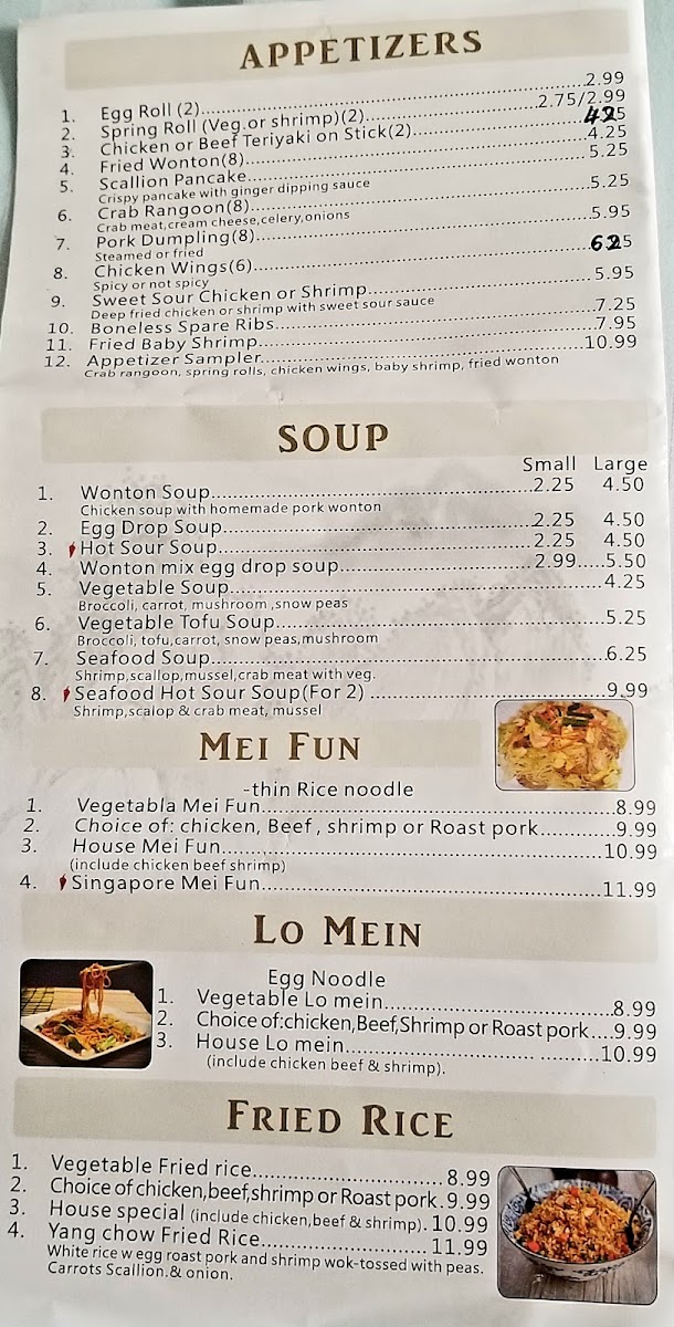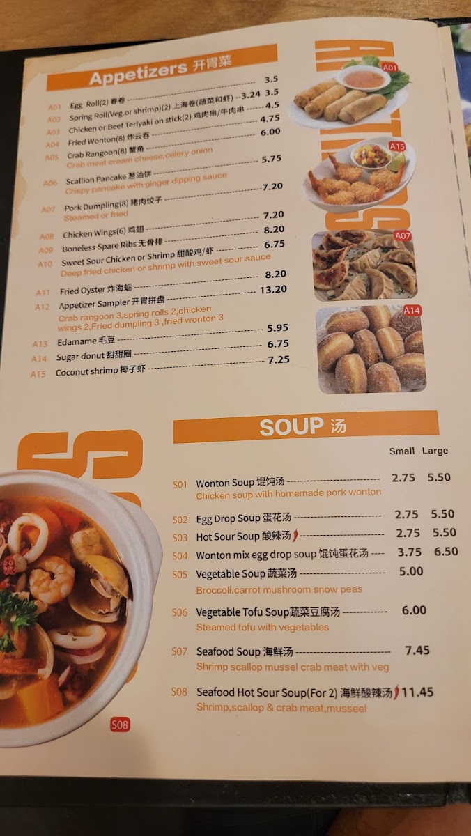 Crab rangoon 3, spring rolls 2, chicken wings 2, fried dumpling 3, fried wonton 3.